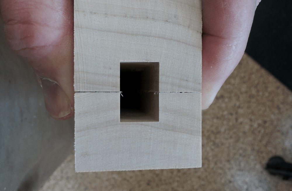 After a few test cuts on the scrap I had dialed it in for a nice friction fit. After the final cuts I fit the pieces together and they fit perfectly except for a small gap at the bottom.
